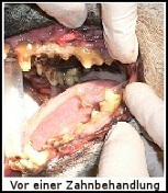 Gerade bei älteren Tieren haben sich daher oft dicke Schichten Zahnstein und Zahnbelag gebildet. Diese haben nicht nur einen unangenehmenen Geruch zur Folge. Schon bei kleinen Verletzungen im Mundbereich, wie sie häufig vorkommen, können Bakterien aus dem Zahnbelag in die Blutbahn gelangen. Kommt es dazu, besiedeln diese Bakterien dann das Herzskelett und führen so zu einer schwierig zu behandelnden und lebensgefährlichen Endokarditis!