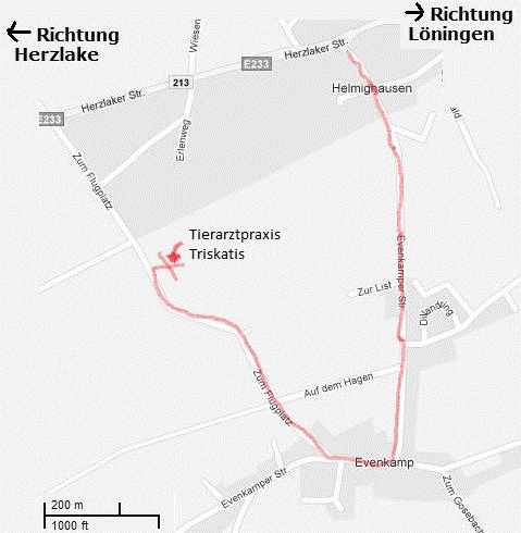 Sie fahren nun durch Evenkamp, vorbei an der St. Johannes Kirche. Nach dieser Kirche macht die Straße eine Rechtskurve, der folgen Sie. Dann biegen Sie rechts - ca. 200m später - auf die Straße Zum Flugplatz ab. Nach ca. 1,7 km liegt die Tierarztpraxis auf der rechten Seite.